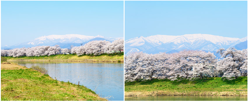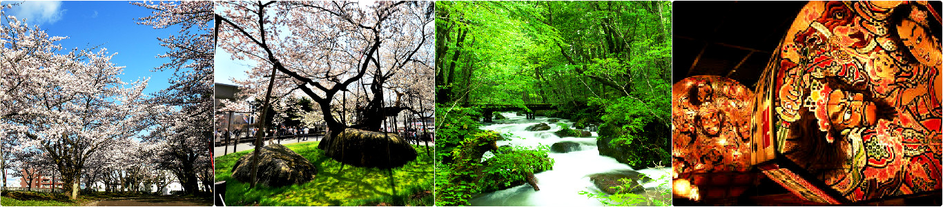 ●【檜木內川堤】此地櫻木的樹齡有80至200年以上的,就多達500株以上,而長堤沿岸約2000公尺的櫻花花海隧道,緩慢地沿著蜿蜒的河展開,就像是櫻花色的雲一樣地蔓延著。與奧羽山脈的殘雪相互輝映,景緻極為迷人。