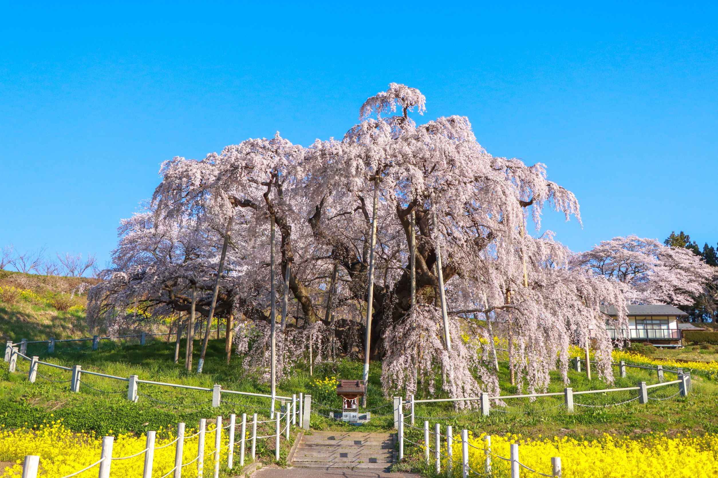 ●【三春瀧櫻】與山梨山高神代櫻、岐阜根尾谷淡墨櫻名列為日本三大櫻,它被列為國家天然紀念物,其樹齡推定有1000年以上,是日本最大枝垂櫻,樹枝東西延展約25M,高則有19M,淡紅色的櫻花順著樹枝而下,像瀑布一般因而得名。