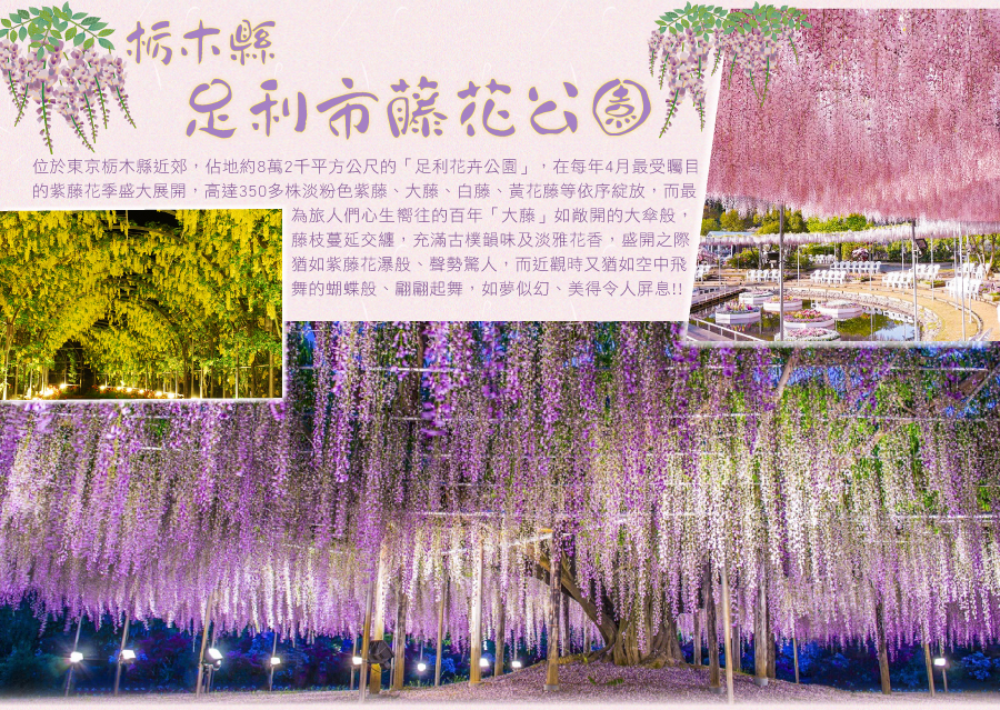 ●【栃木足利紫藤公園】最具代表的花卉,屬於多年生藤蔓植物,莖具纏繞性,直徑達10公分以上,常被用作棚架觀賞植物(花期4月中旬至5月中旬)總狀花序側生在枝端,20~30朵紫色小花整齊排列,開花時蝶形花朵成串下垂,長度可達15~30公分,花量大時彷彿紫色瀑布,美得令人屏息。公園裡的紫藤約300棵,每逢盛開時聲勢驚人,被公認是全世界最漂亮的紫藤花美景,園內最受矚目的「大藤」、「白藤通道」、「八重黑龍大藤」,甚至被列為栃木縣指定天然紀念物。「大藤」是園區的主打招牌,共有3株,樹齡已超過130年,它的藤架範圍廣達600個榻榻米,垂掛的花穗就像瀑布,非常壯觀!稀有的「八重黑龍大藤」花朵為重瓣,遠遠看每串花就像一串葡萄,而且香氣濃郁。「白藤通道」長80公尺,密生的花穗讓人感受無比柔美與幸福。
