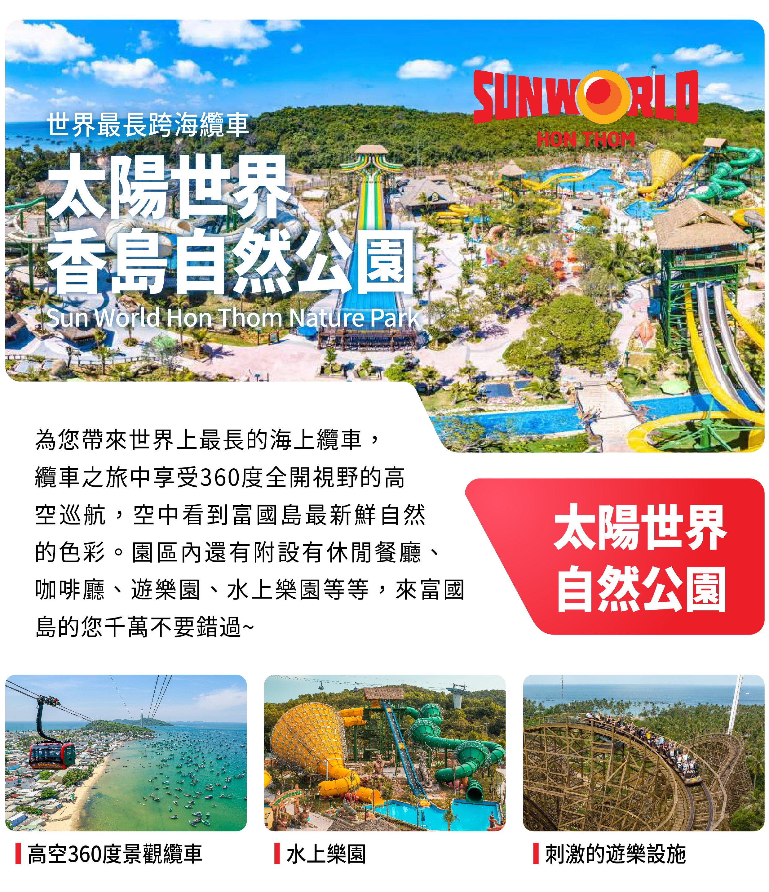 【360度全景跨海纜車】為世界上最長的海上纜車,是越南太陽集團最閃亮的娛樂品牌,太陽世界Sun World在越南發展觀光旅遊且獲得許多國際獎項,大受好評,繼中越巴拿山和峴港,越南最北端沙霸,北越下龍灣到2018最新開幕的越南最南端的Sun World Hon Thom Nature Park富國島太陽世界自然公園,目前共計有五大娛樂主題樂園系列。
